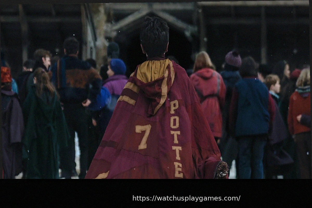The image itself shows Harry Potter from behind, distinguishable by his iconic Seeker uniform, as he prepares to enter a majestic Quidditch stadium. It’s widely presumed this scene depicts his very first match between Gryffindor and Slytherin, a detail subtly suggested by the distinct house tapestries visible in the background. The photo also offers a revealing glimpse into the detailed costumes worn by other Hogwarts students, providing a taste of the series’ visual style.