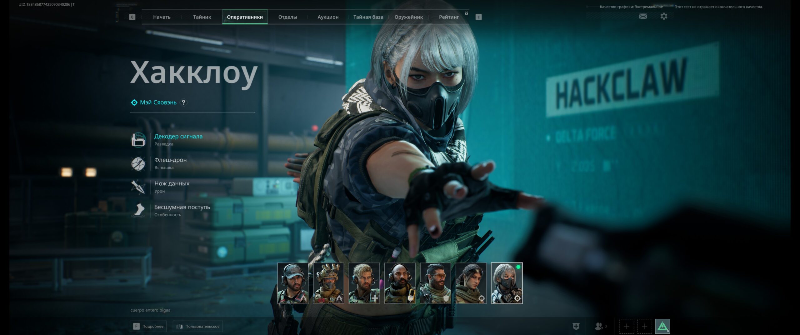 While Luna gathers intel from afar, Hackclaw specializes in close-range stealth recon. Her Silent Step trait reduces footstep noise and increases crouching movement speed, enabling her to skulk. She uses her Signal Decoder to scan and track enemies, deploys a Flash Drone to blind enemies at range, and wields a Data Knife to hack nearby electronic devices.