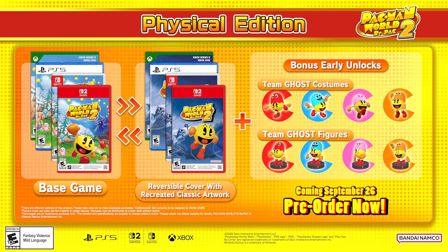 The Standard Edition of Pac-Man World 2 Re-Pac includes the core game. For physical copies, a special feature is the reversible cover art, allowing players to choose between the new Re-Pac artwork and a recreation of the original 2002 key art. This edition is available for pre-order on PS5, Xbox, Switch 2, Switch, and PC platforms, with both physical and digital options.